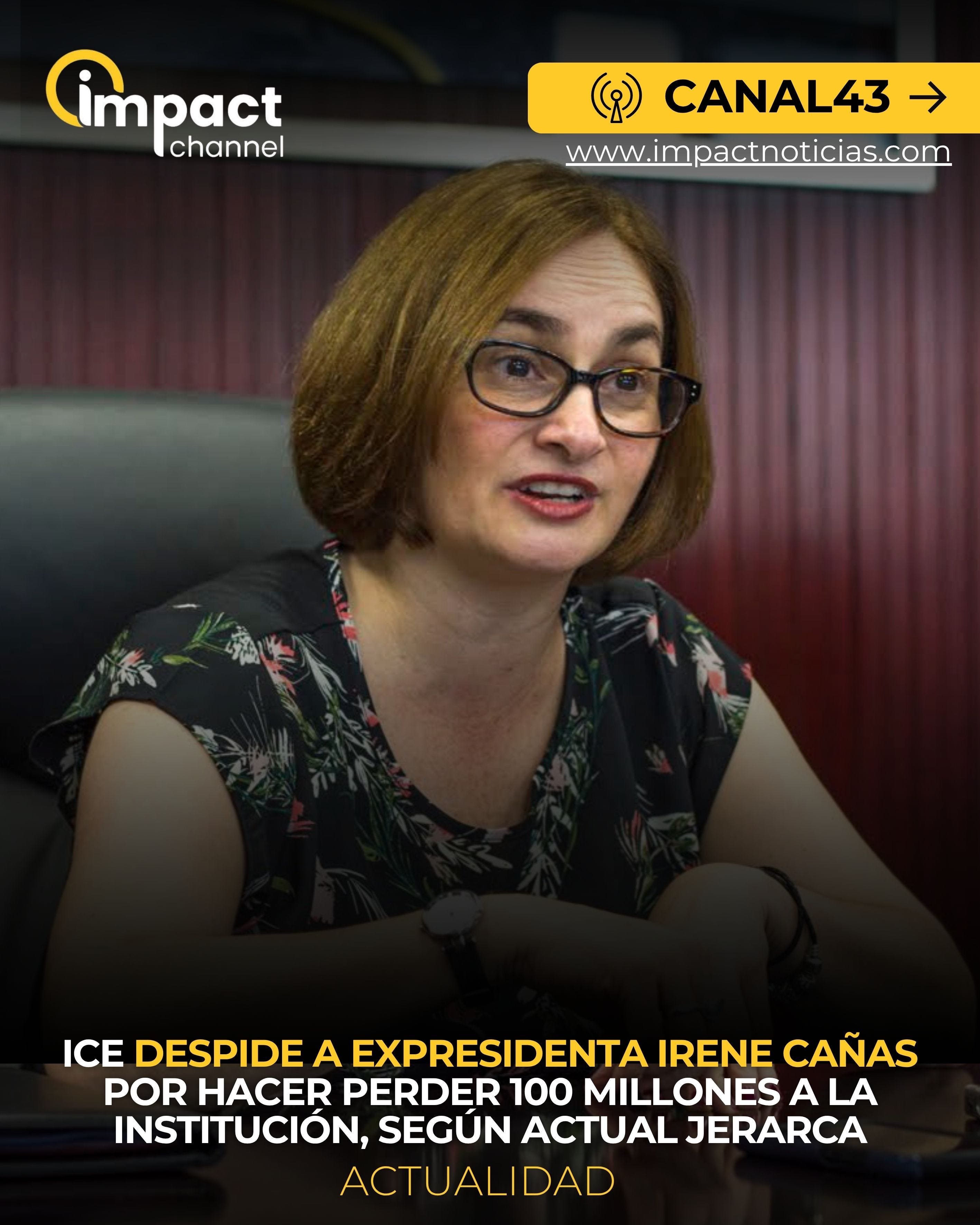 Después de más de tres años de iniciar un proceso contra la expresidenta del ICE, Irene Cañas, la institución dejó en firme la semana pasada su despido, así lo confirmó el actual presidente ejecutivo de la institución, Marco Vargas, ante una consulta de Impact Channel.